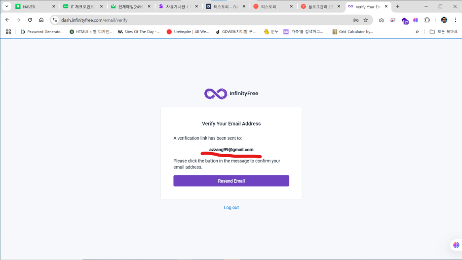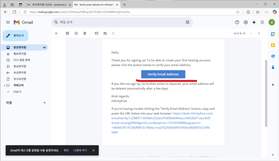 여기서 자신의 메일 주소로 확인 메일이 옵니다. 자신 메일 주소로 가셔서 메일 내용을 확인해야 합니다.