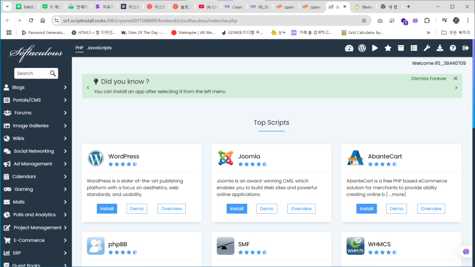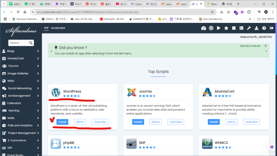 자 여기서 WordPress 란에 Install 이라는 버튼이 보이시면 이제 부터 워드프레스(WordPress) 를 설치(Install) 버튼을