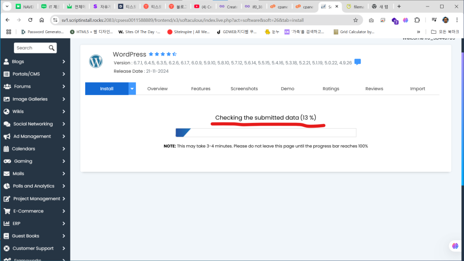 표시된 부분을 클릭하게 되면 우리가 원하는 워드프레스(Wordpress)를 설치하게 됩니다.