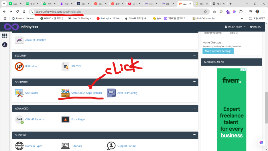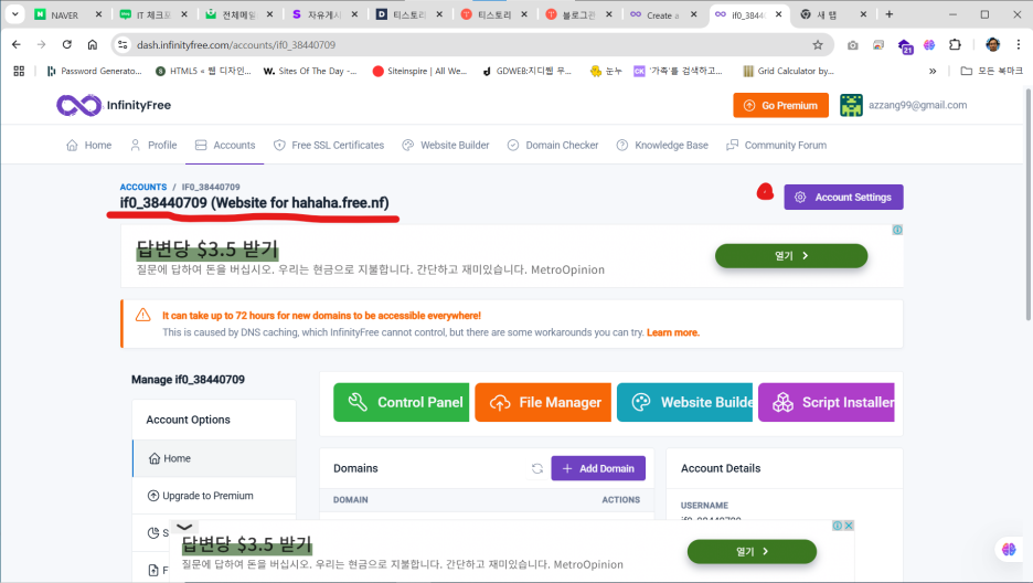 이 페이지는 아주 중요합니다. 왜냐구여!!!~~~ 자신의 도메인 주소와 비밀번호가 자동으로 생성되어 있습니다.