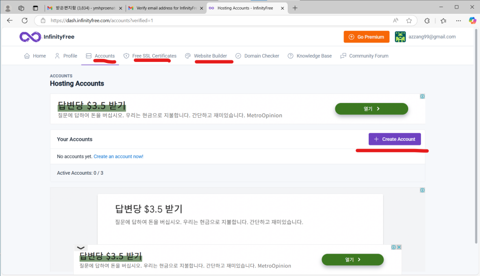Create Account 버튼을 클릭하면 다음 페이지로 넘어 가게 됩니다. 이 과정은 무료로 임대 서버를 사용하기 위한 것입니다.