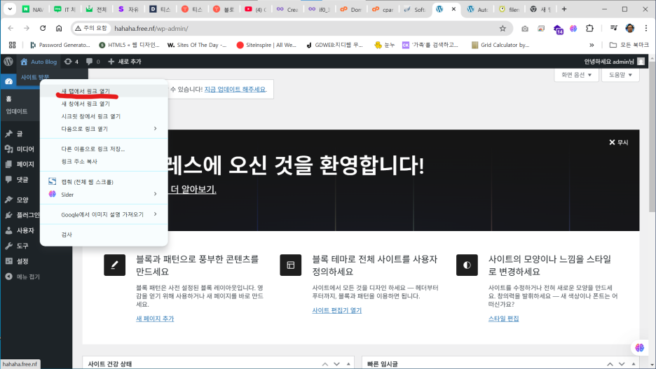 여기서 자신의 사이트 관리자 페이지로 이동해 보시기 바랍니다.