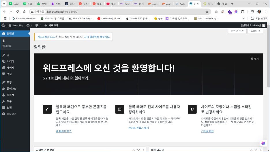 정상적으로 로그인이 되어 있다면 워드프레스 관리자 페이지가 보이게 됩니다.