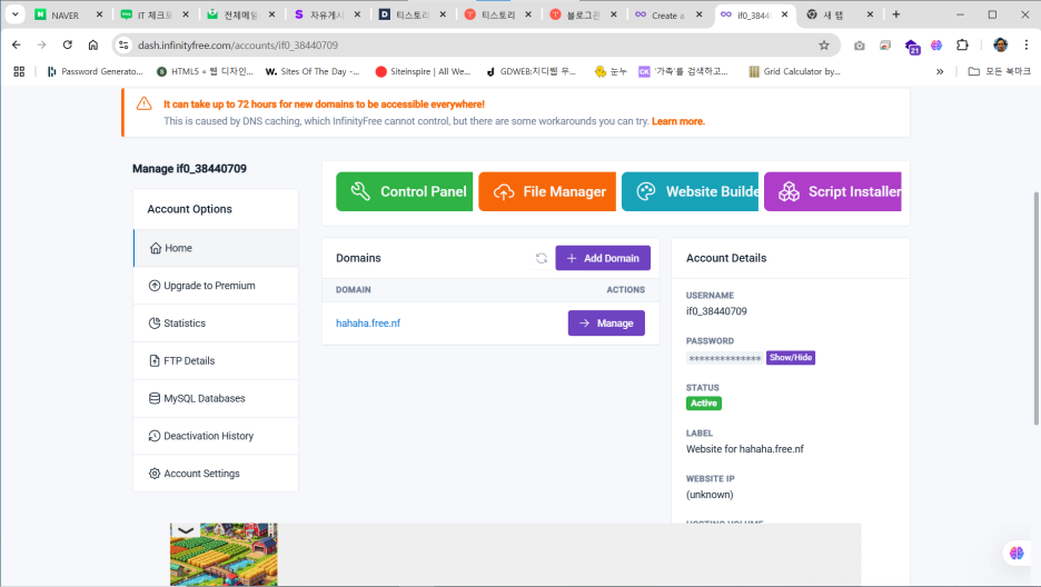 이 페이지는 아주 중요합니다. 왜냐구여!!!~~~ 자신의 도메인 주소와 비밀번호가 자동으로 생성되어 있습니다.
