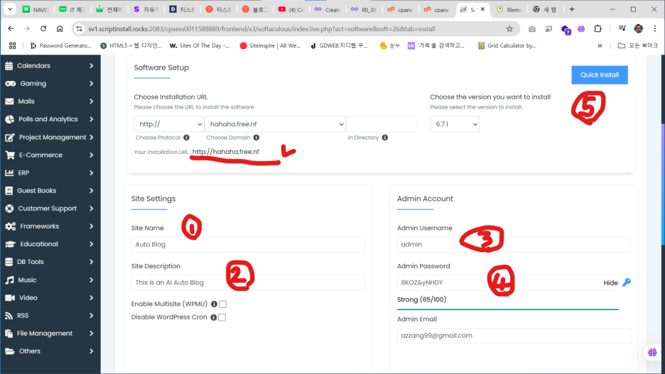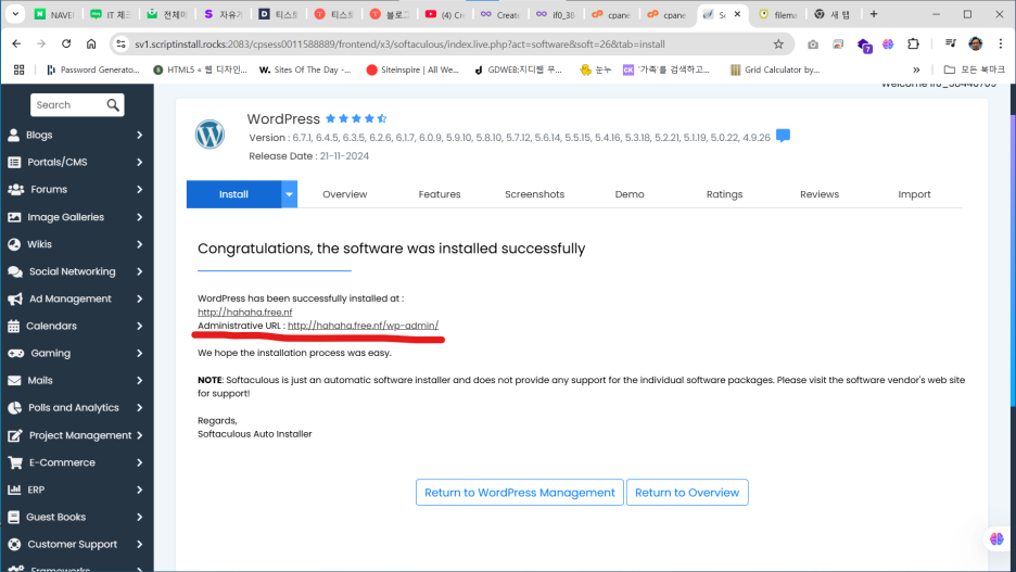 설치가 완료된 후 페이지 입니다. 여기서 해당 밑줄이 표시해 두었습니다. 첫 http:// 로 시작하는 주소가 이제까지 만든 무료 도메인 주소이고